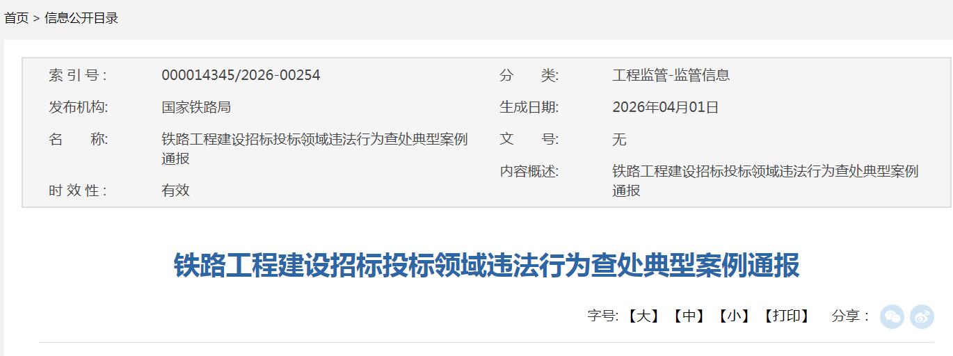 为进一步规范铁路工程建设招标投标领域市场秩序,充分发挥典型案例的警示教育作用,持续对违法行为主体形成有效震慑,现选取一批铁路监管部门查处的违法典型案例予以通报。